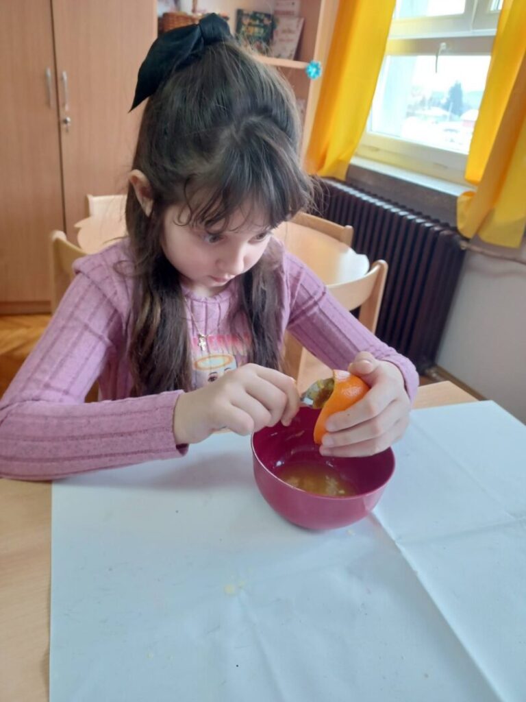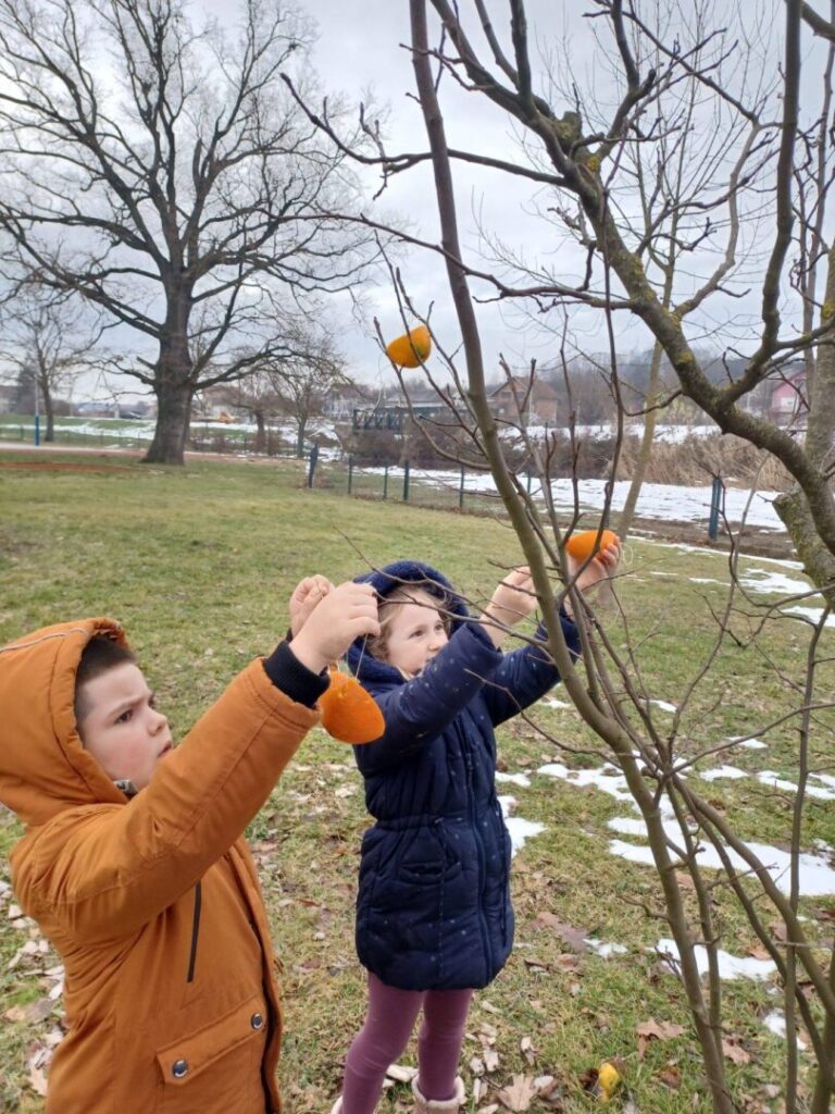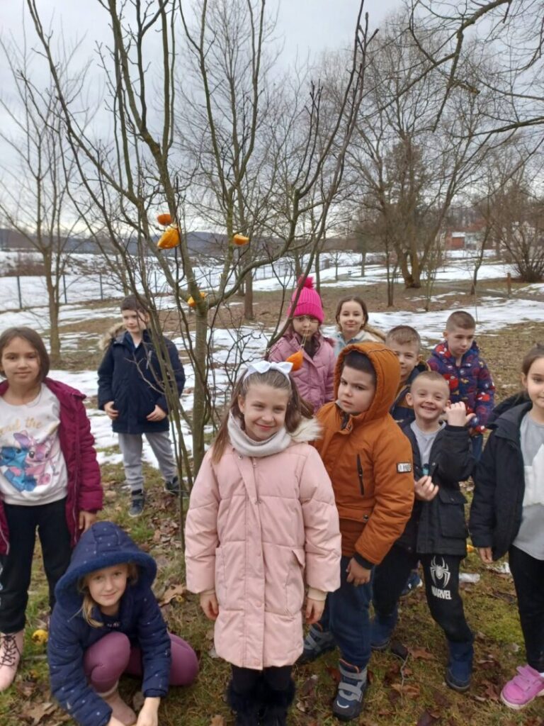 Učenici 1. razreda sa svojom učiteljicom sudjelovali su u zanimljivoj i poučnoj aktivnosti izrade hranilica za ptice. Kao prirodni materijal koristili smo naranče koje smo pažljivo izdubili i napunili sjemenkama za ptice.