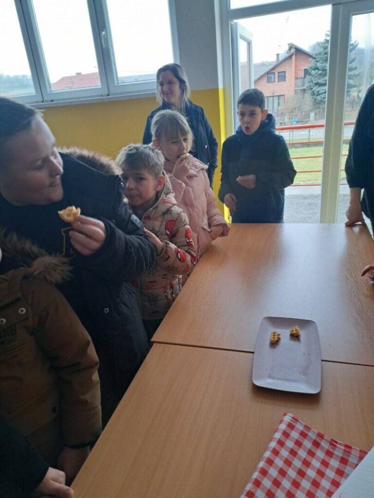 Smjese je bilo dovoljno, ali pekač za vafle nije uspijevao ispeći onoliko brzo koliko su ih mali sladokusci s veseljem jeli. Osmijesi na licima učenika i prazne tacne najbolji su dokaz uspješnosti ove aktivnosti.
