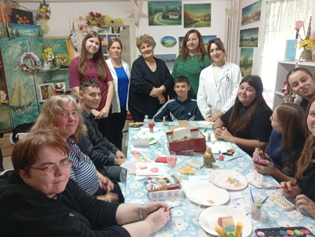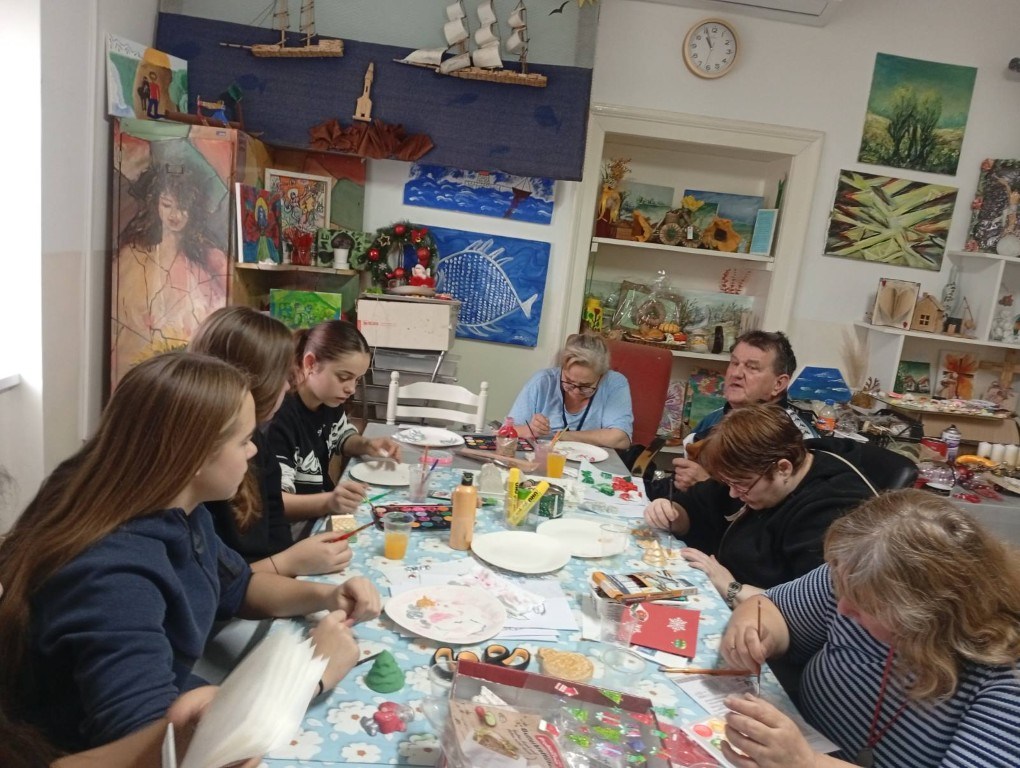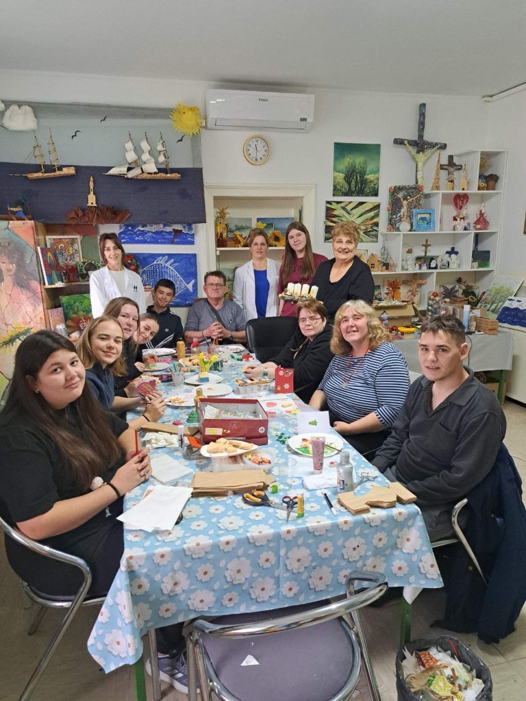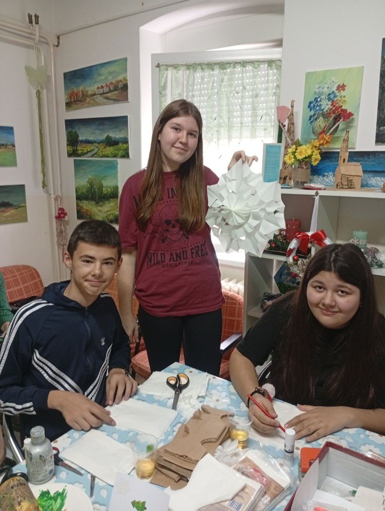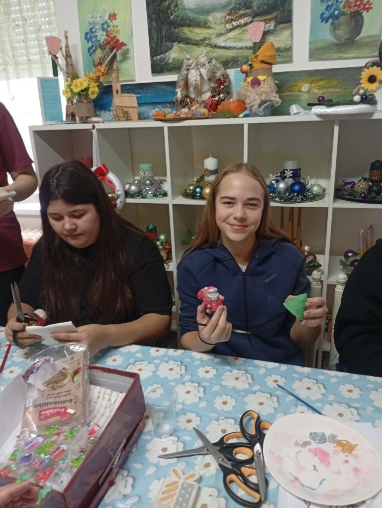 Dio učenika koji pohađaju aktivnost Školski volonterski klub “Sovice”, u pratnji edukatorice rehabilitatorice Aleksandre Andrić Radišić i pedagoginje Ljiljane Đurđević zajedno su s korisnicima Doma za odrasle osobe Ljeskovica izrađivali božićne ukrase za nadolazeće blagdane.
