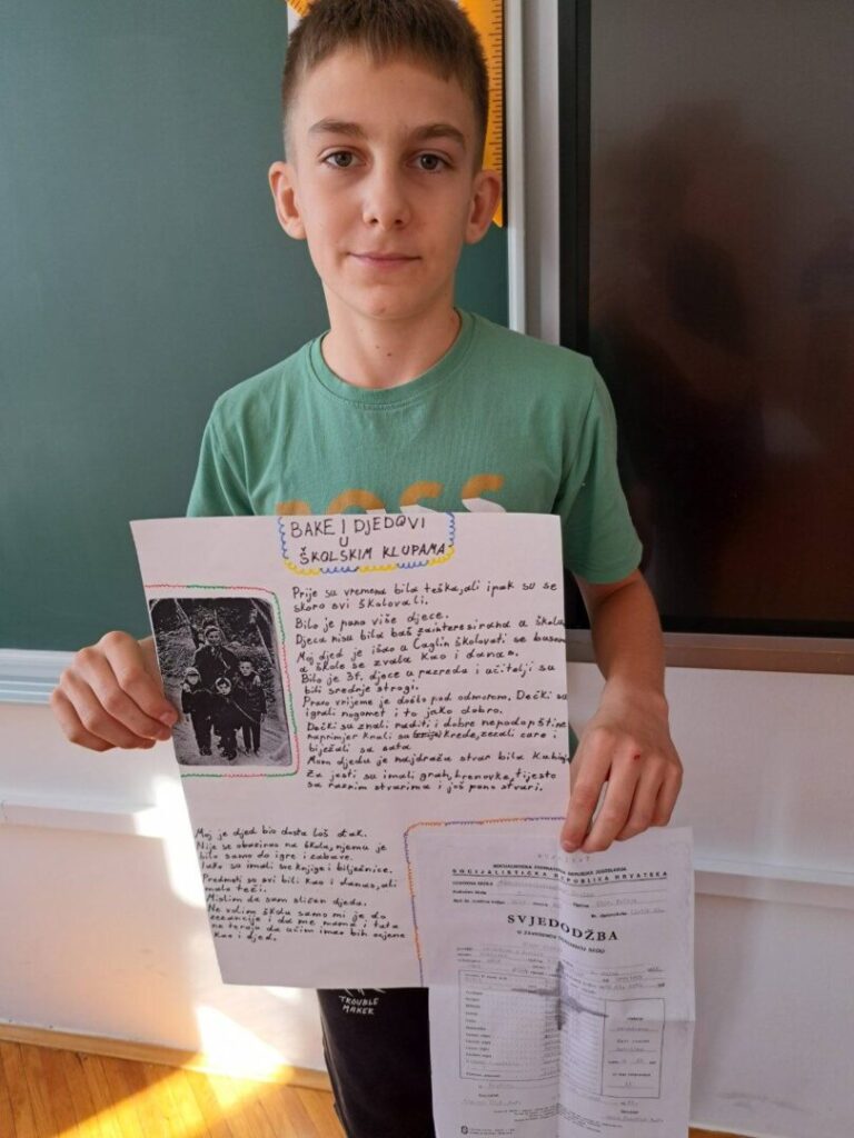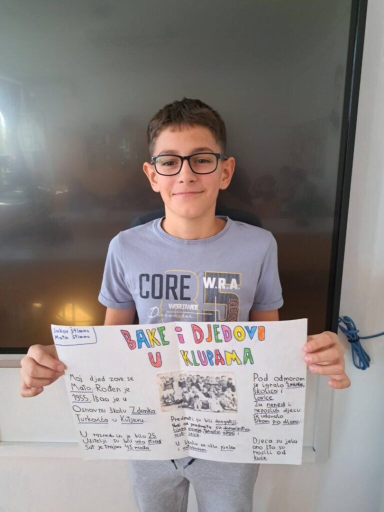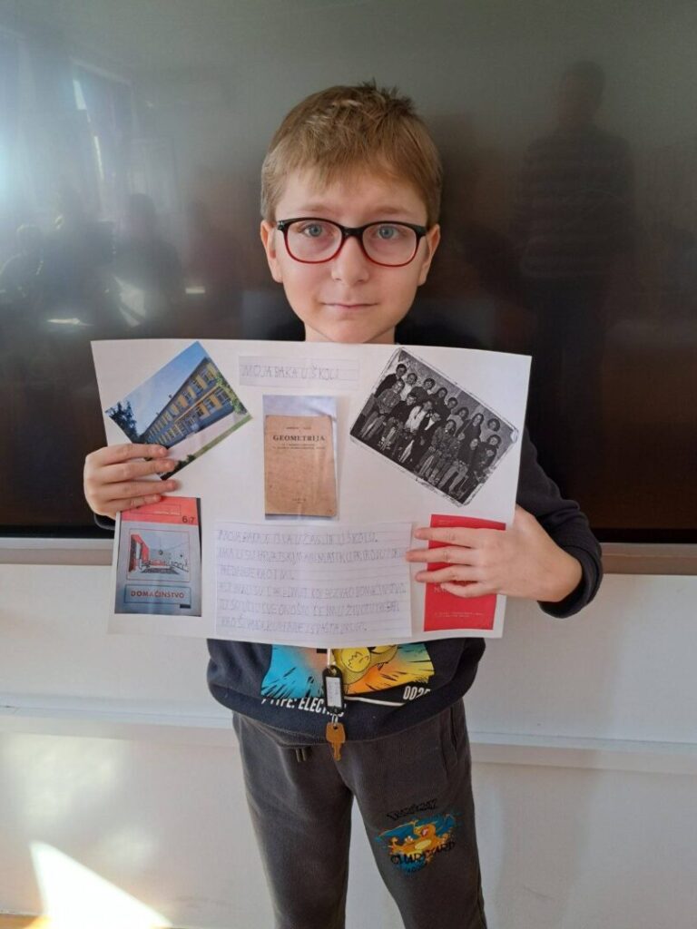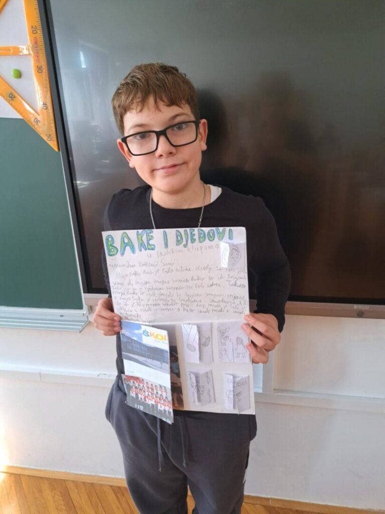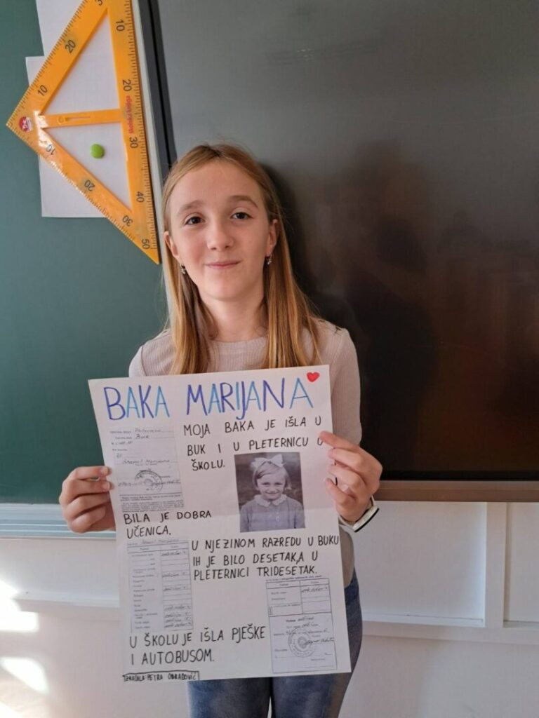 Čuli smo mnogo zanimljivih priča o školovanju u prošlim vremenima – kako su učitelji bili strogi i kažnjavali djecu šibama, koji su se predmeti prije učili a danas više ne postoje, kako su izgledale prve školske ljubavi, koji su bili omiljeni i omraženi predmeti, kako se igralo na putu do škole i do kuće… Na kraju smo došli do zaključka da su djeca uvijek ista i da je škola danas lakša nego prije, a bitnije od toga da su se učenici kroz ovaj projekt dodatno zbližili sa svojim bakama i djedovima