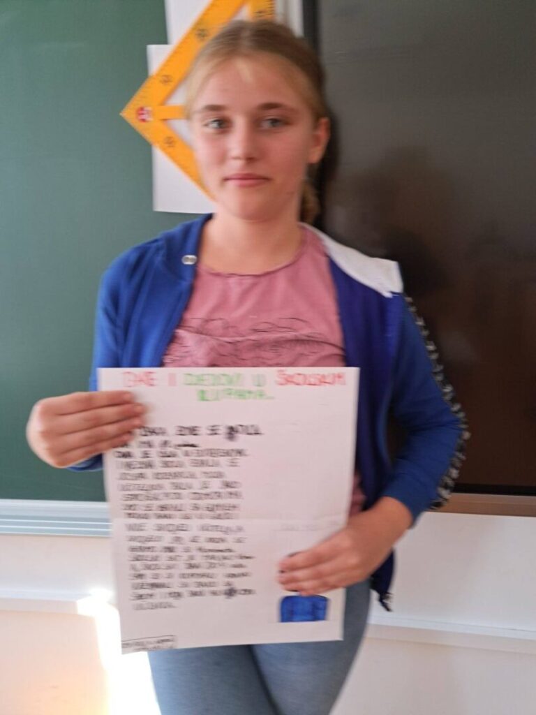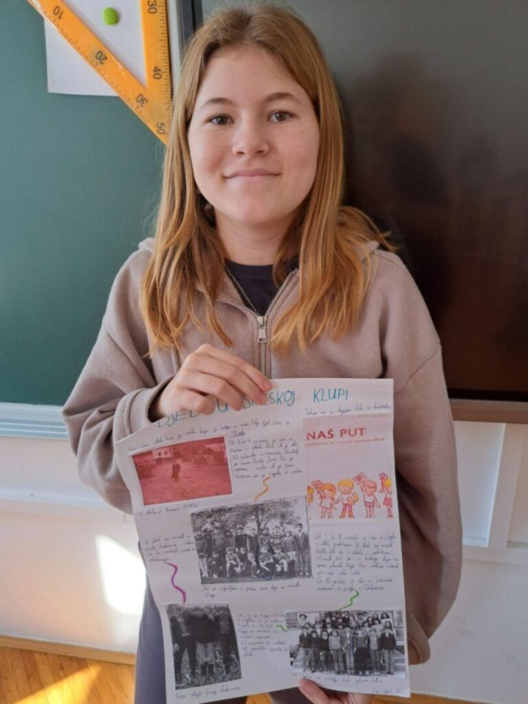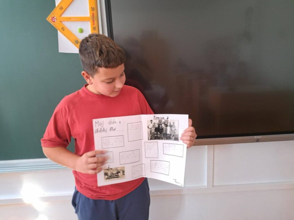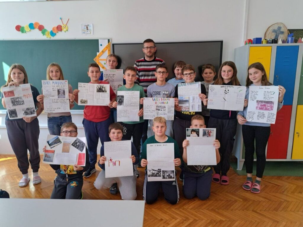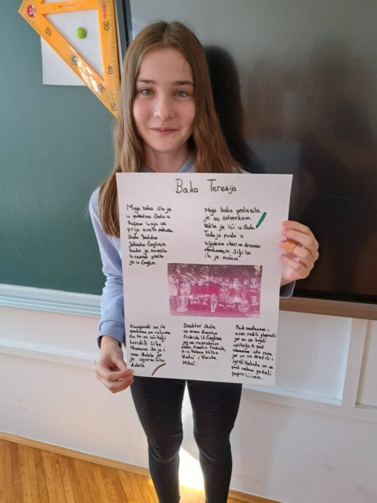 Čuli smo mnogo zanimljivih priča o školovanju u prošlim vremenima – kako su učitelji bili strogi i kažnjavali djecu šibama, koji su se predmeti prije učili a danas više ne postoje, kako su izgledale prve školske ljubavi, koji su bili omiljeni i omraženi predmeti, kako se igralo na putu do škole i do kuće… Na kraju smo došli do zaključka da su djeca uvijek ista i da je škola danas lakša nego prije, a bitnije od toga da su se učenici kroz ovaj projekt dodatno zbližili sa svojim bakama i djedovima