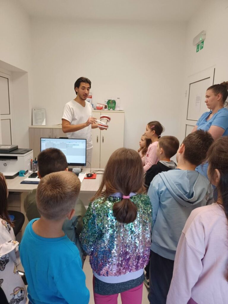 U sklopu projekta „Zdravozubci“, naši veseli prvašići, u pratnji učiteljice Željke Peić, posjetili su stomatološku ordinaciju kako bi na zabavan i poučan način naučili koliko je važno brinuti o zdravlju svojih zubića. Tamo ih je srdačno dočekao stomatolog Matej Tunjić, koji ih je odmah razveselio svojim osmijehom i prijateljskim pristupom.