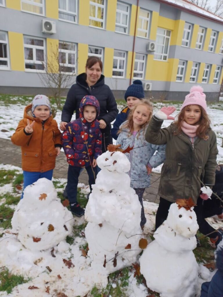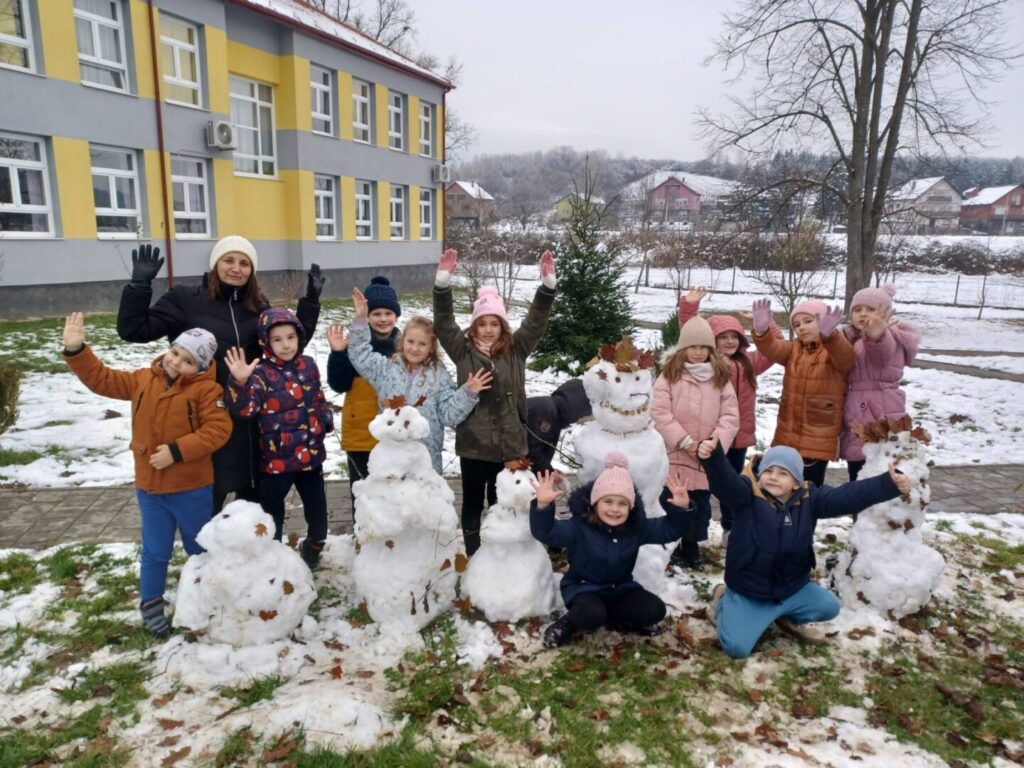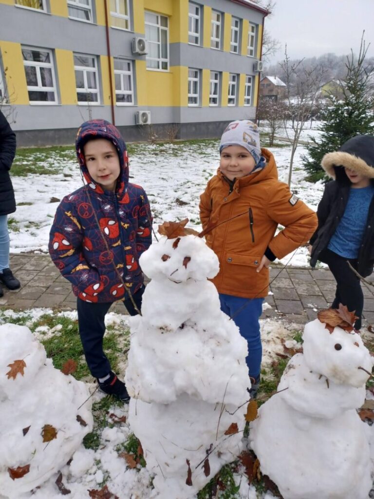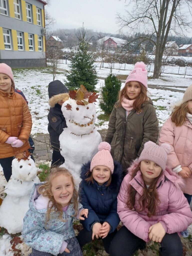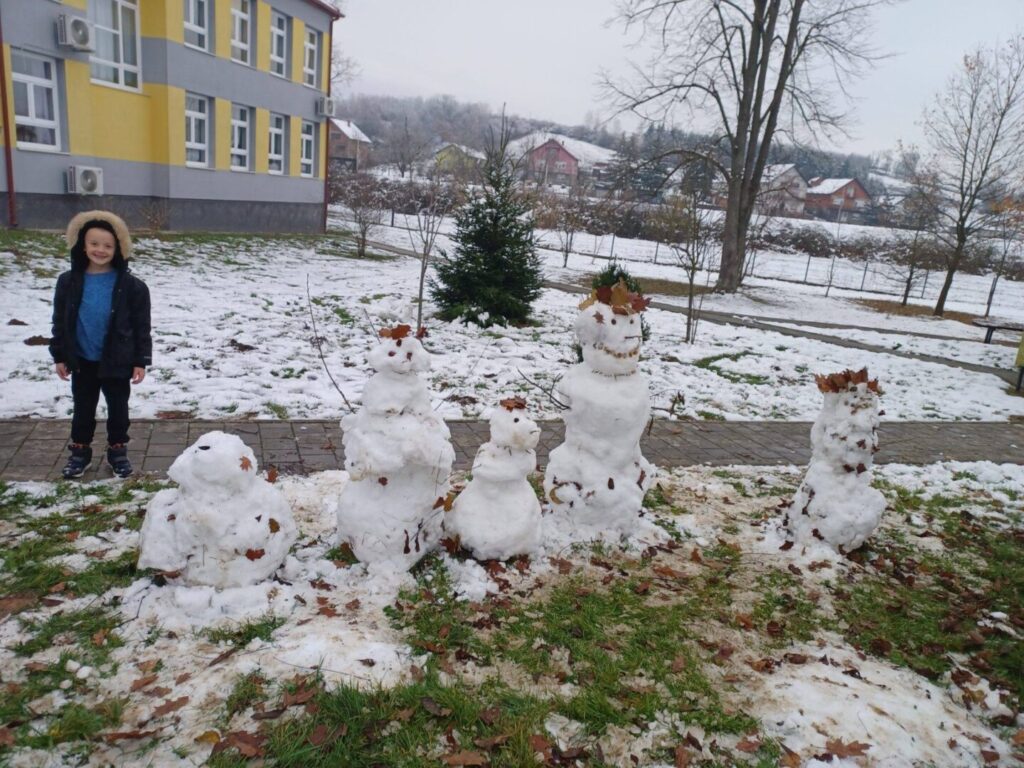 Najveće oduševljenje izazvalo je zajedničko stvaranje snjegovića. Naši su prvašići u prirodi pronašli sve što im je trebalo — oči, zube, nos i grančice za ruke. No njihov snjegović dobio je i poseban naslov: jesenski snjegović, jer su ga ukrasili šarenim jesenskim lišćem, dajući mu originalan i maštovit izgled.